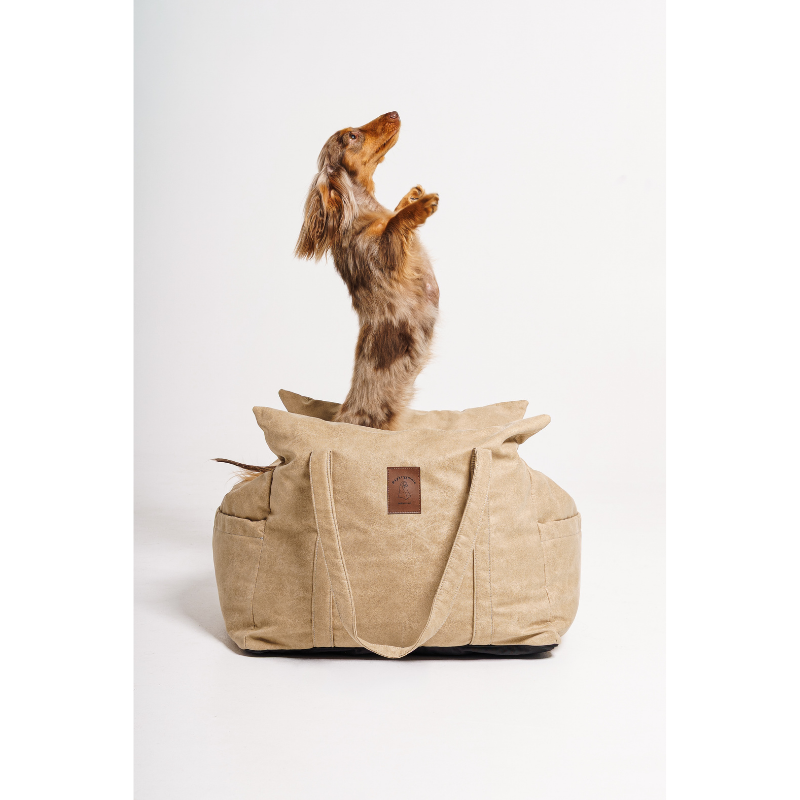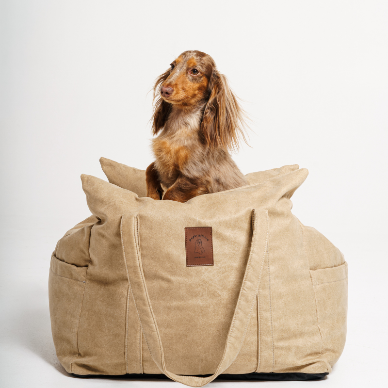 Fotelik do samochodu dla psa wypełniony jest mieszanką kulki silikonowej. Dwa uchwyty fotelika służą do łatwego przenoszenia.