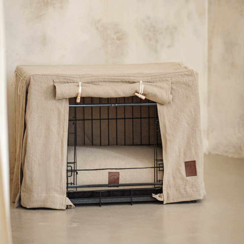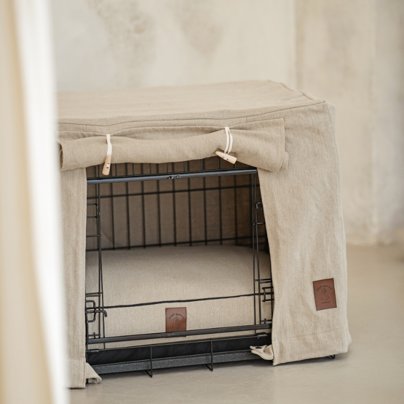 Naturalna tkanina lniana sprawia, że klatka kennelowa przestaje wyglądać jak tymczasowy element, a zaczyna być spójną częścią wnętrza domu.