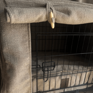 Osłona na klatkę kennelową posiada dwa otwory na drzwi – boczne i główne. Każde z drzwi można zakryć lub odkryć w zależności od potrzeb naszych i naszego pupila. Tkaninę, która odkrywa drzwi można zawinąć w rulon i spiąć dekoracyjnymi, drewnianymi guzikami. Tkanina, która została wycięta na drzwi luźno opada na klatkę. Zapewnia dobry przepływ powietrza. Osłona dodatkowo mocowana jest do klatki za pomocą zaczepów na napy, które zapobiegają wciągnięciu tkaniny do środka przez psa.